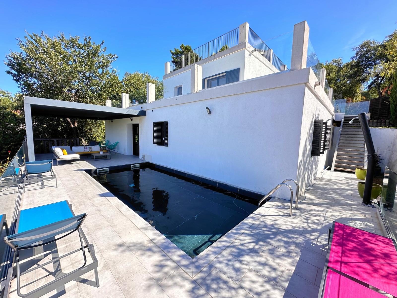 Auf den malerischen Höhen von Vidauban gelegen, besticht diese elegante kalifornische Villa aus dem Jahr 2015 durch ihre moderne Architektur, hochwertige Ausstattung und den faszinierenden Blick auf das Dorf. Auf zwei unabhängigen Ebenen bietet die Immobilie zwei Apartments, jeweils mit großzügigem Wohnbereich und moderner, voll ausgestatteter Küche, lichtdurchflutet durch große Panoramafenster. Das 1.000 m2 große, liebevoll gestaltete Grundstück verfügt über einen Pool, Jacuzzi, bioklimatische Pergola, 70 m2 großen Wellnessbereich sowie ein eingerichtetes Spielhaus für Kinder. Mit ihren Panorama-Terrassen und exzellentem thermischen Komfort (Energieklasse AA) vereint diese außergewöhnliche Villa Charme, Modernität und attraktives Vermietungspotenzia